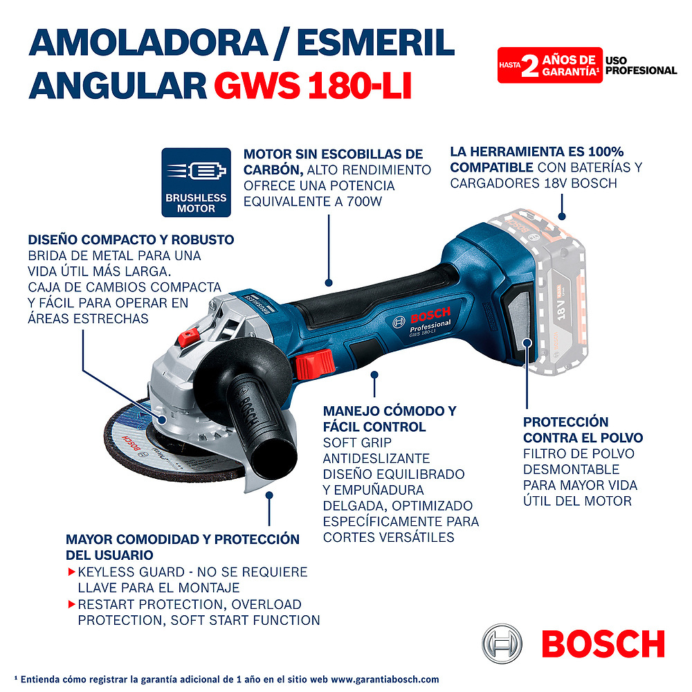 El Esmeril inalambrico Bosch GWS 180-LI de Bosch, 18V y motor Brushless, es el más pequeño y liviano del mercado. Tiene una potencia equivalente a una herramienta con cable de 700W y tiene protección contra el polvo, ya que viene con un filtro desmontable para una mayor vida útil del motor. Por ser ergonómico, ofrece un manejo más cómodo y seguro.
